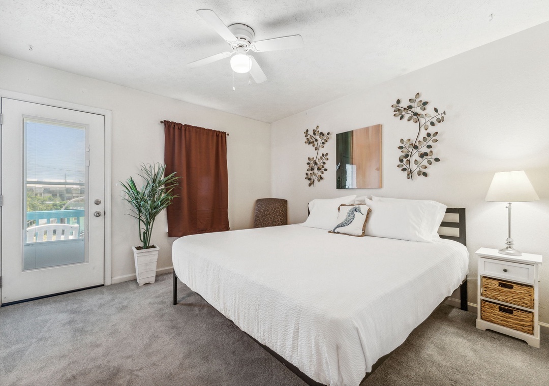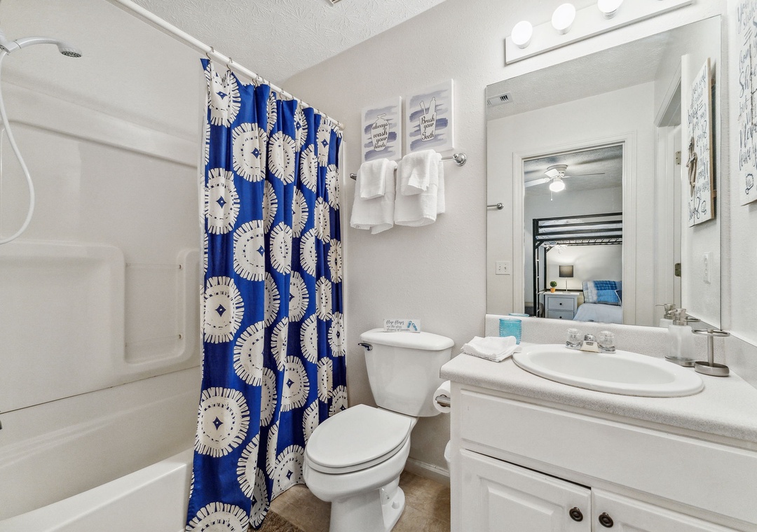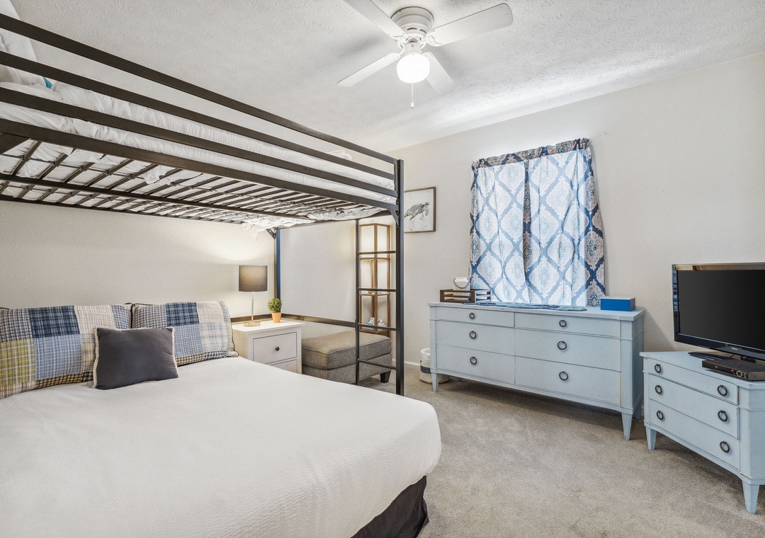 The master bedroom features a plush king bed, providing a serene sanctuary to unwind after a day at the beach. The guest bedroom is equally inviting, with a cozy twin over full bunk bed, ensuring a comfortable stay for everyone.