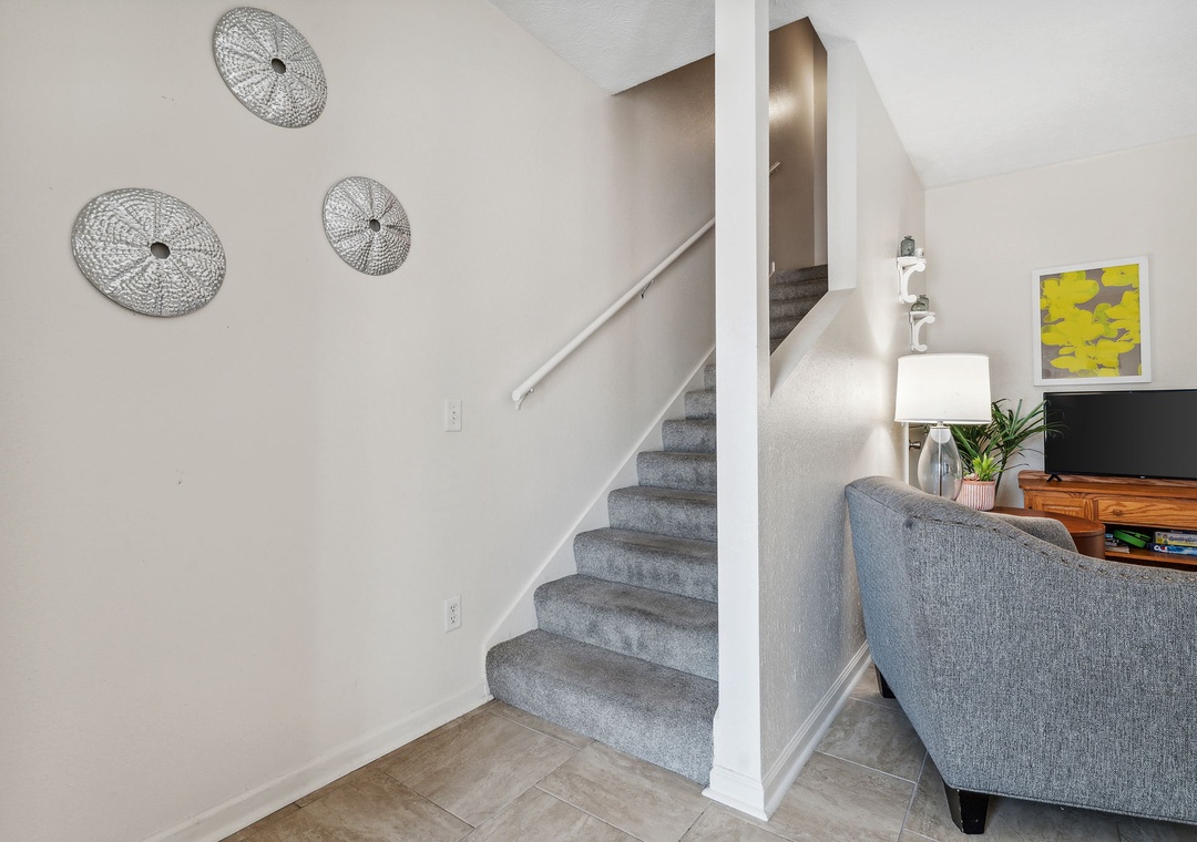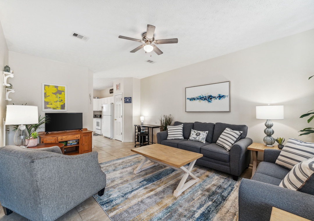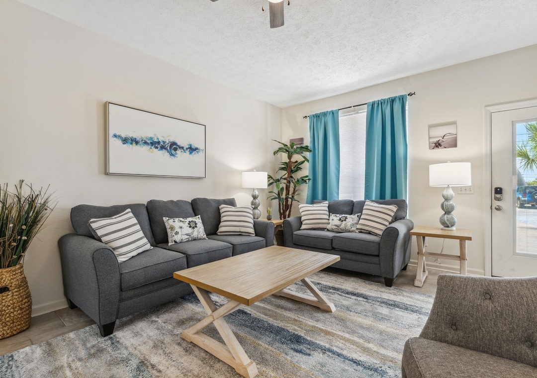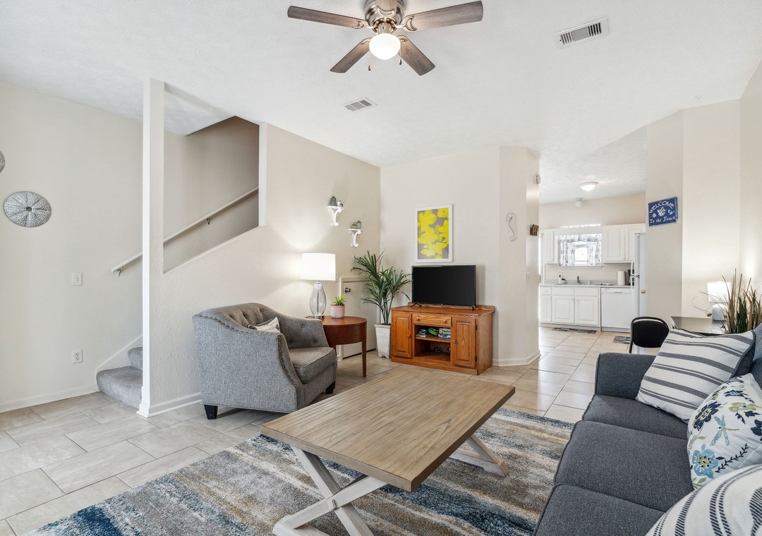 Nestled in the heart of Panama City Beach. This charming two-bedroom, two-and-a-half-bathroom townhome offers the perfect blend of home type comfort and beachy vacation for your next getaway. As you step inside, you'll find the living room is spacious and has plenty of stretch out space.