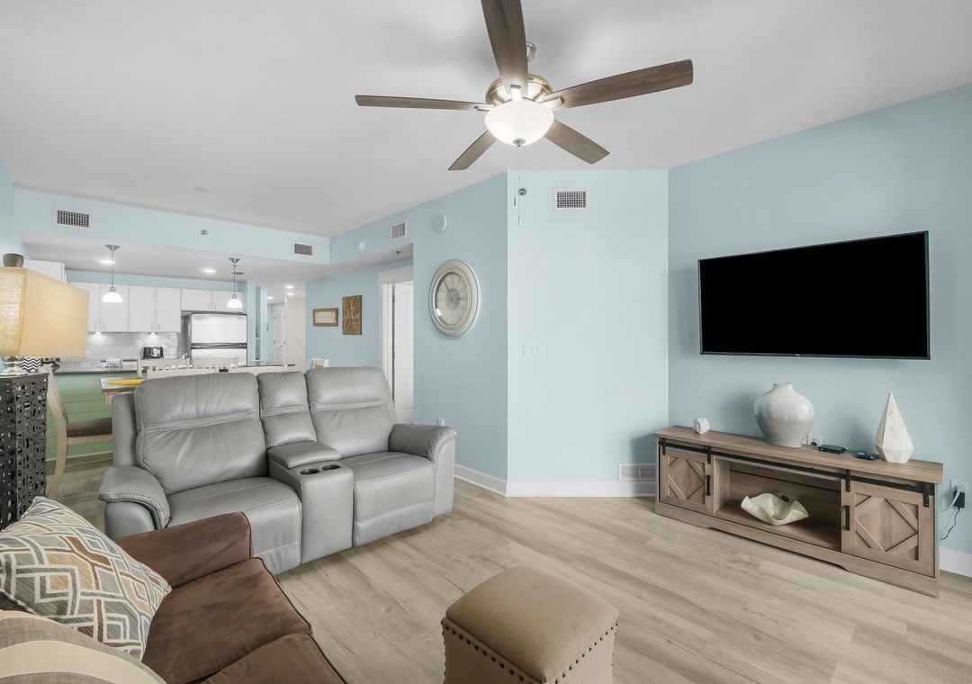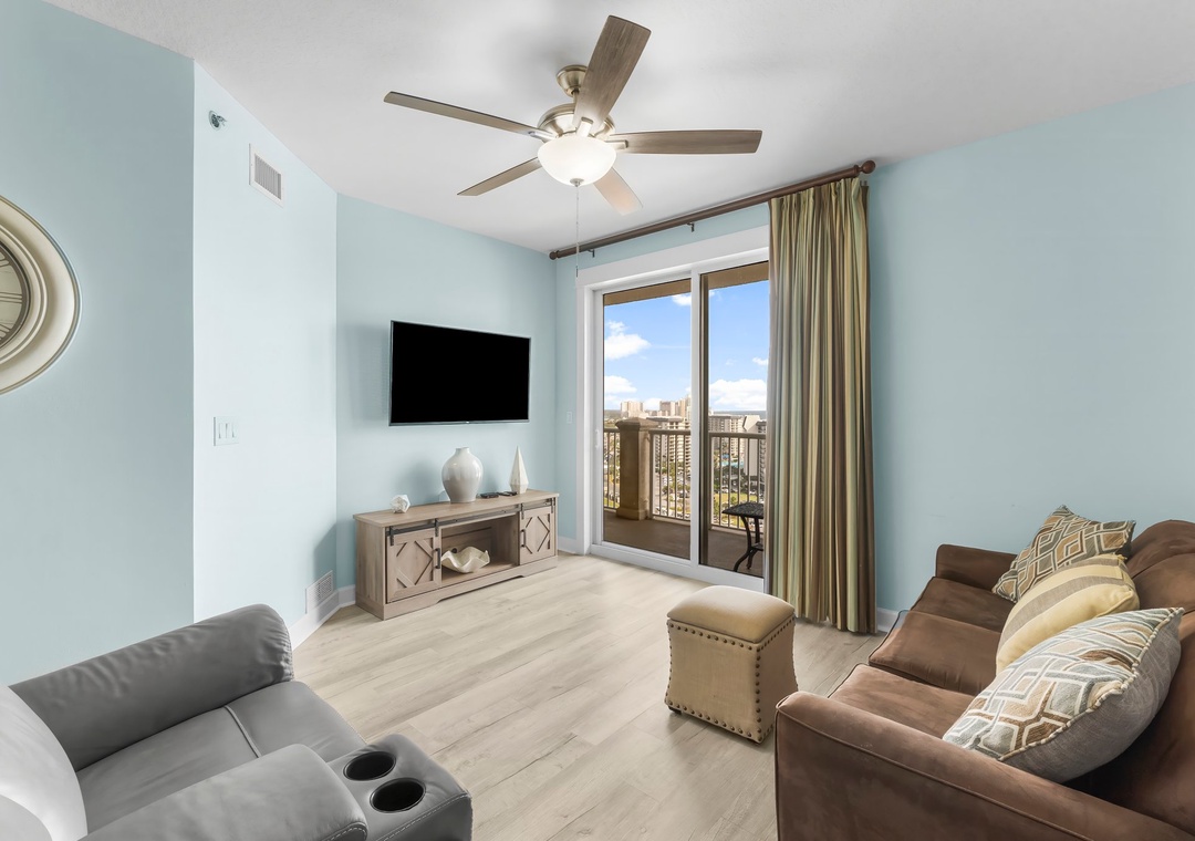 The open concept living area is perfect for unwinding after a day of adventure. Enjoy the comfortable seating, flat-screen TV, and access to the private balcony, which also has chairs and side tables for enjoying that fresh cup of coffee in the morning.