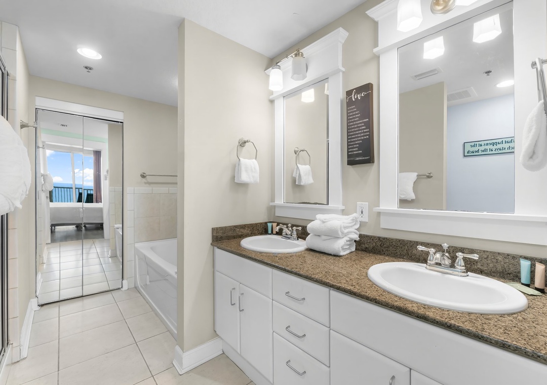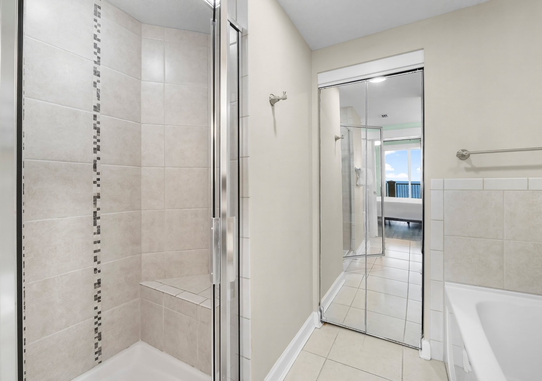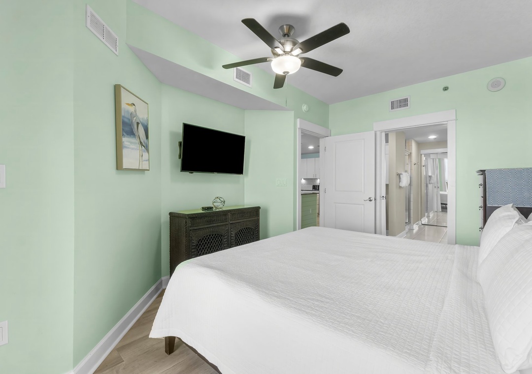 This unit offers two spacious bedrooms the master bedroom features a plush king-size bed, smart tv, and an en-suite bathroom with a walk-in shower and soaker tub, while the second bedroom offers a cozy queen-sized bed with TV.