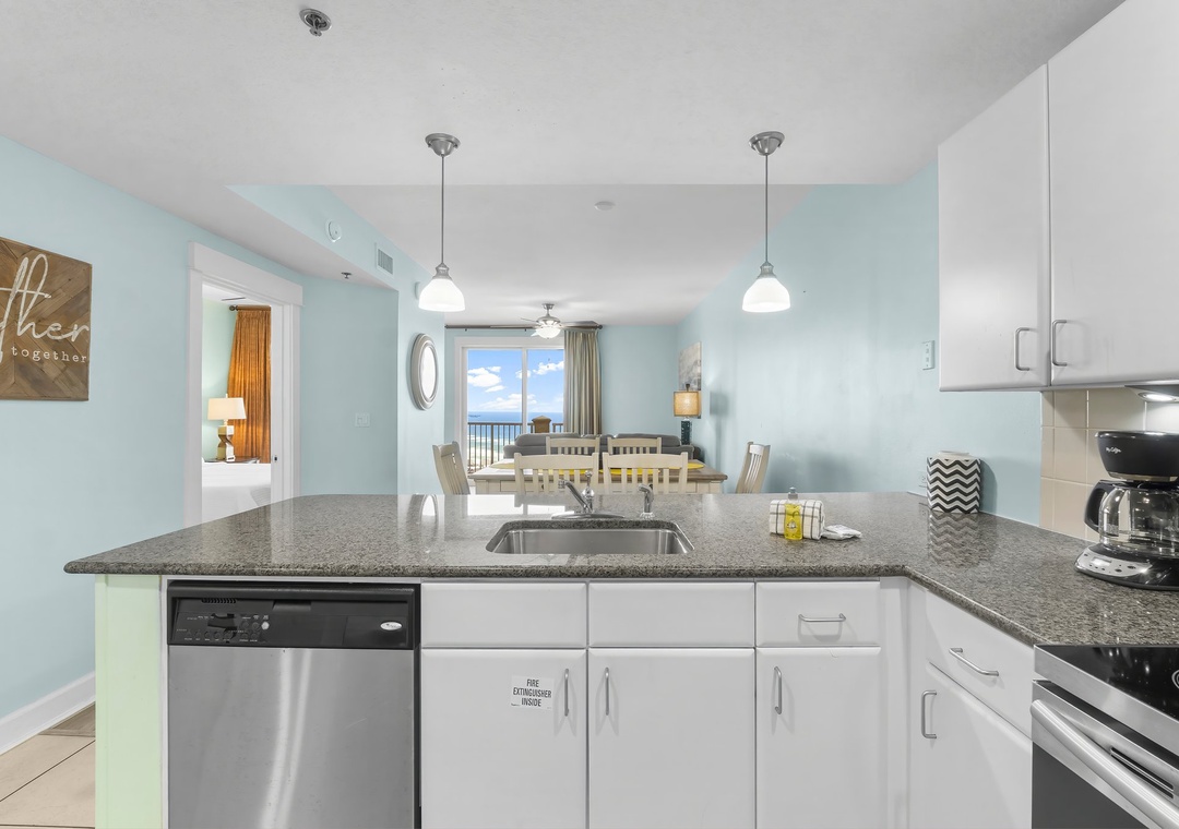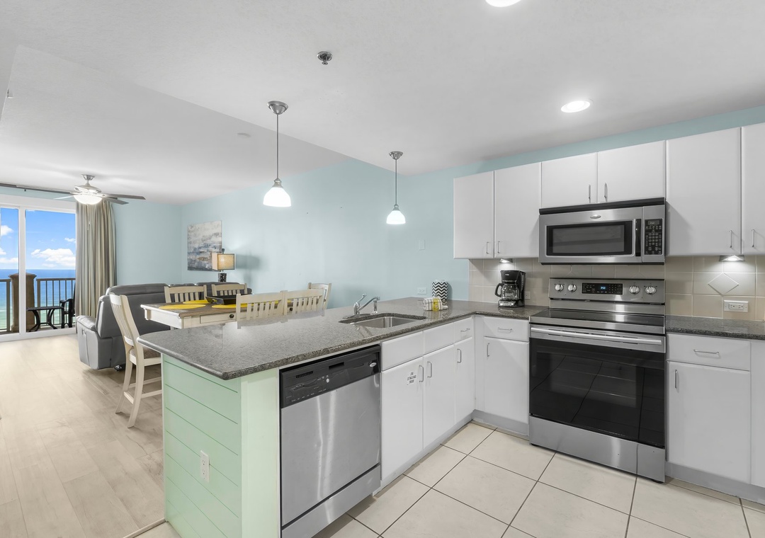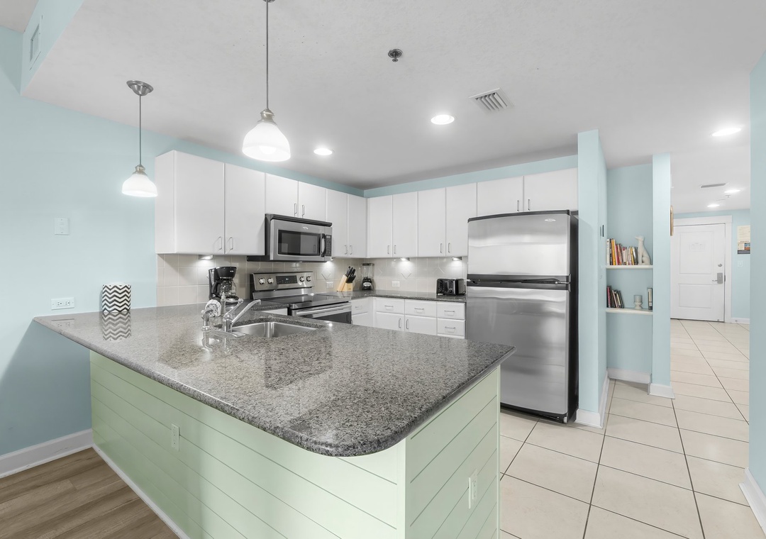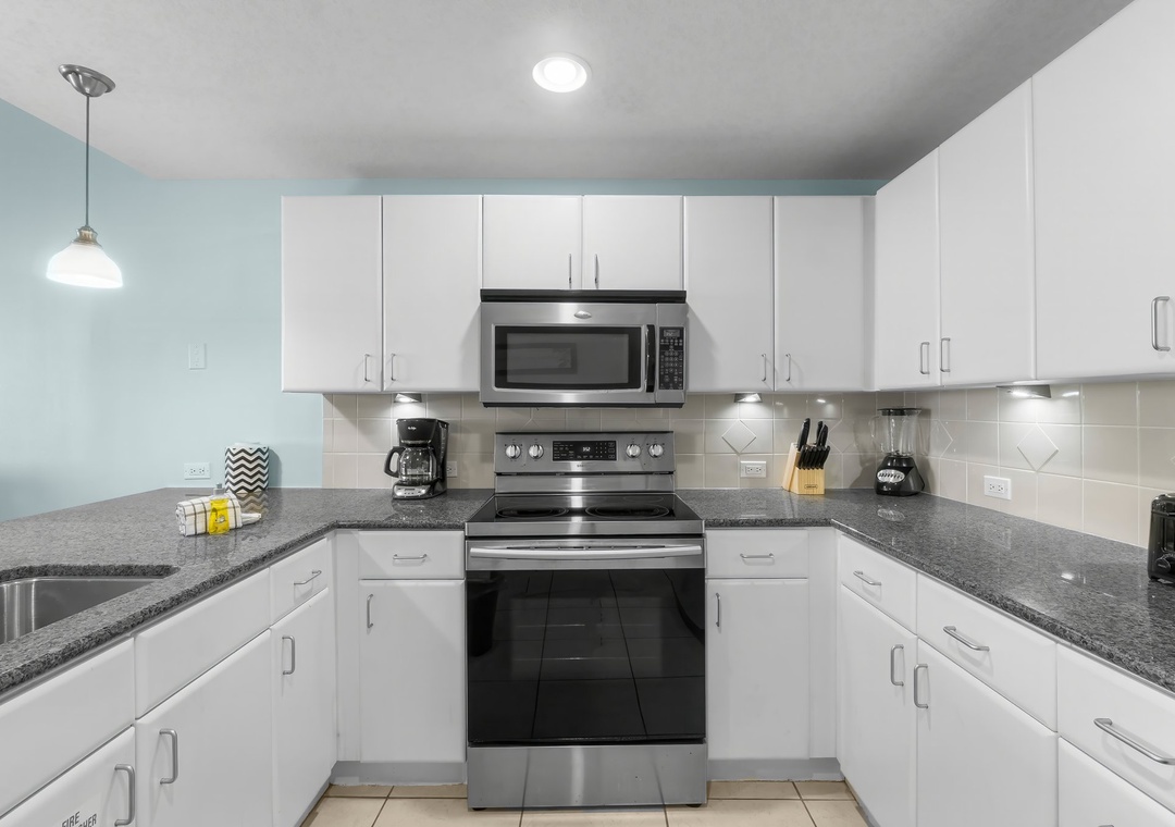 The kitchen comes fully equipped with stainless steel appliances, granite countertops, and all the essentials needed to prepare delicious meals. Pots, pans, silverware and glasses are all available for guest use.