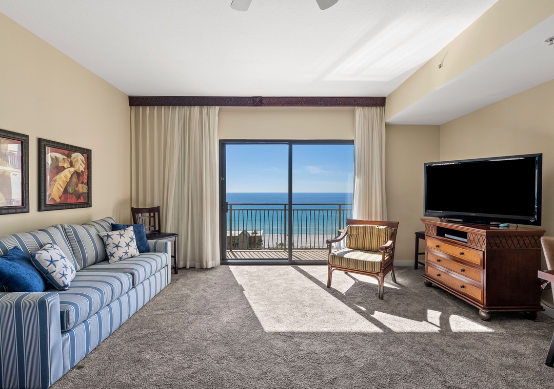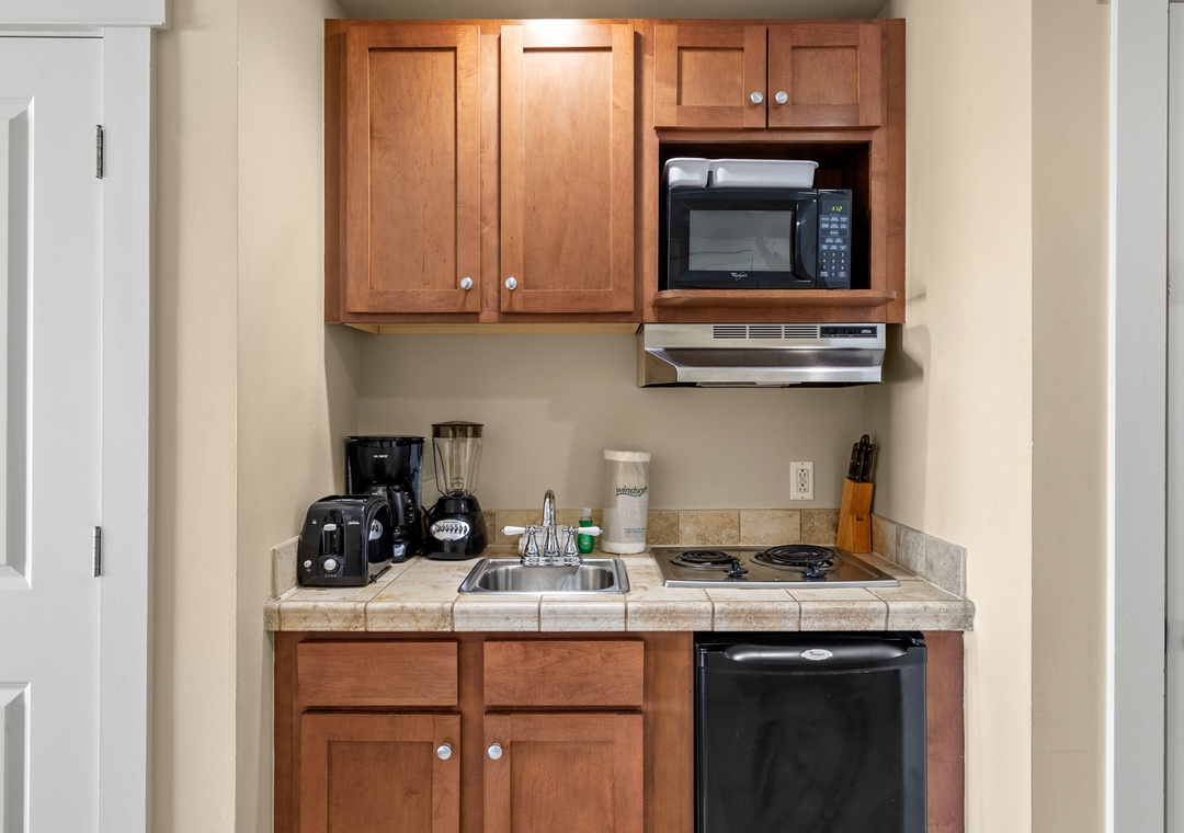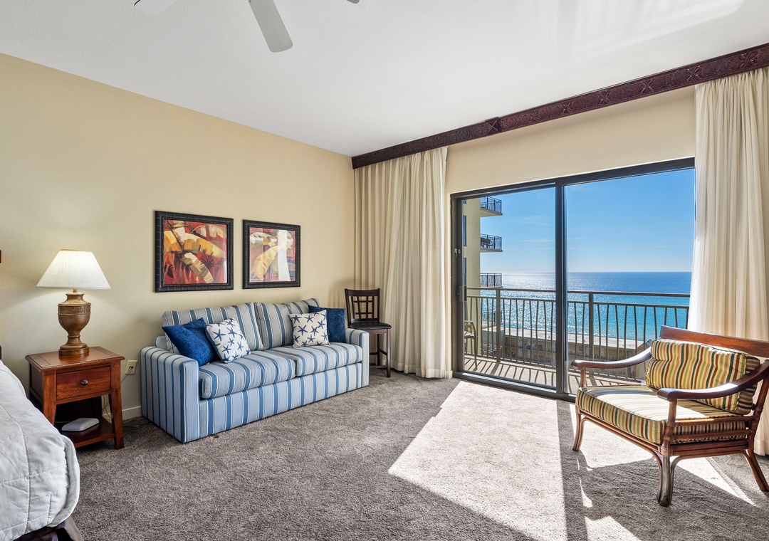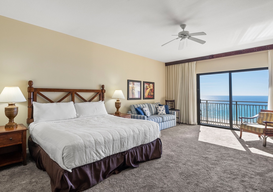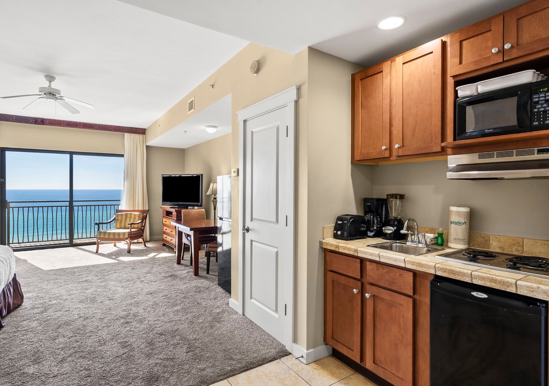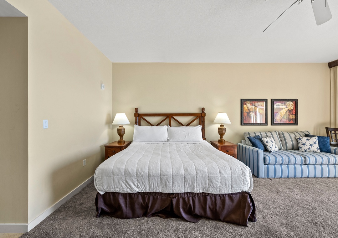 Studio King condo units include one king bed, a pull-out sofa sleeper, a living and dining area with a mini-refrigerator, microwave, sink, coffee maker, 1-flat-screen TV, 1-full bath, as well as private beach access and covered parking.