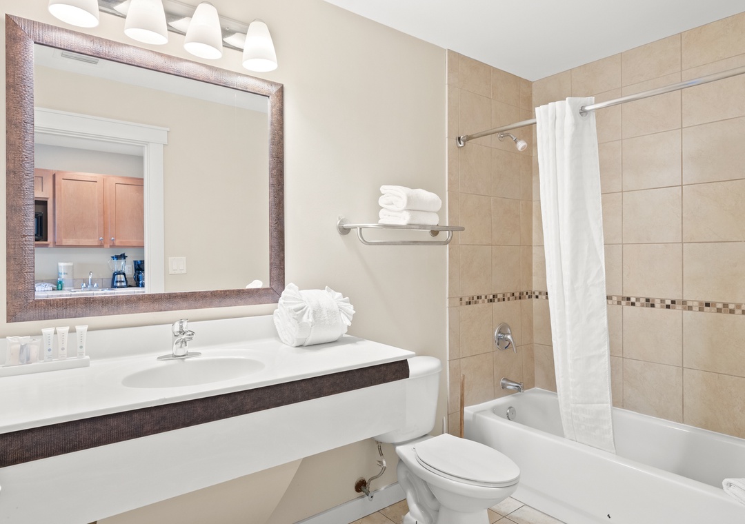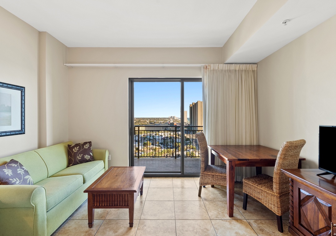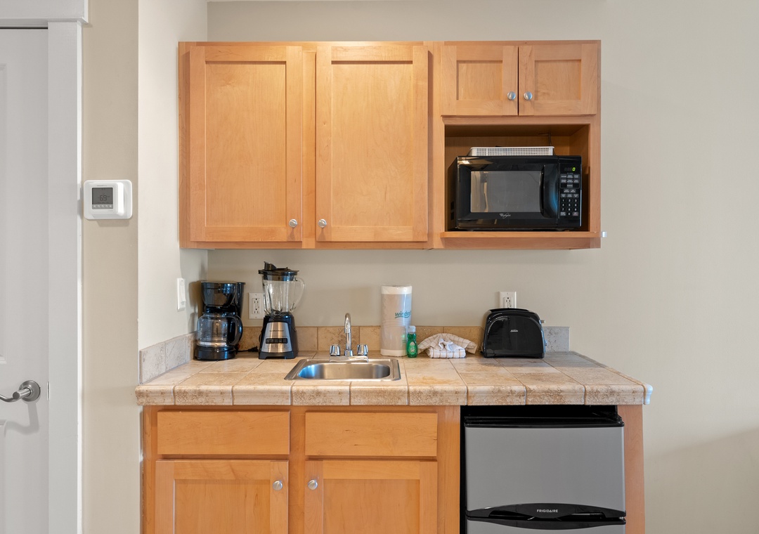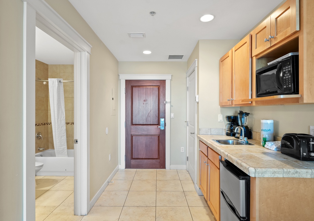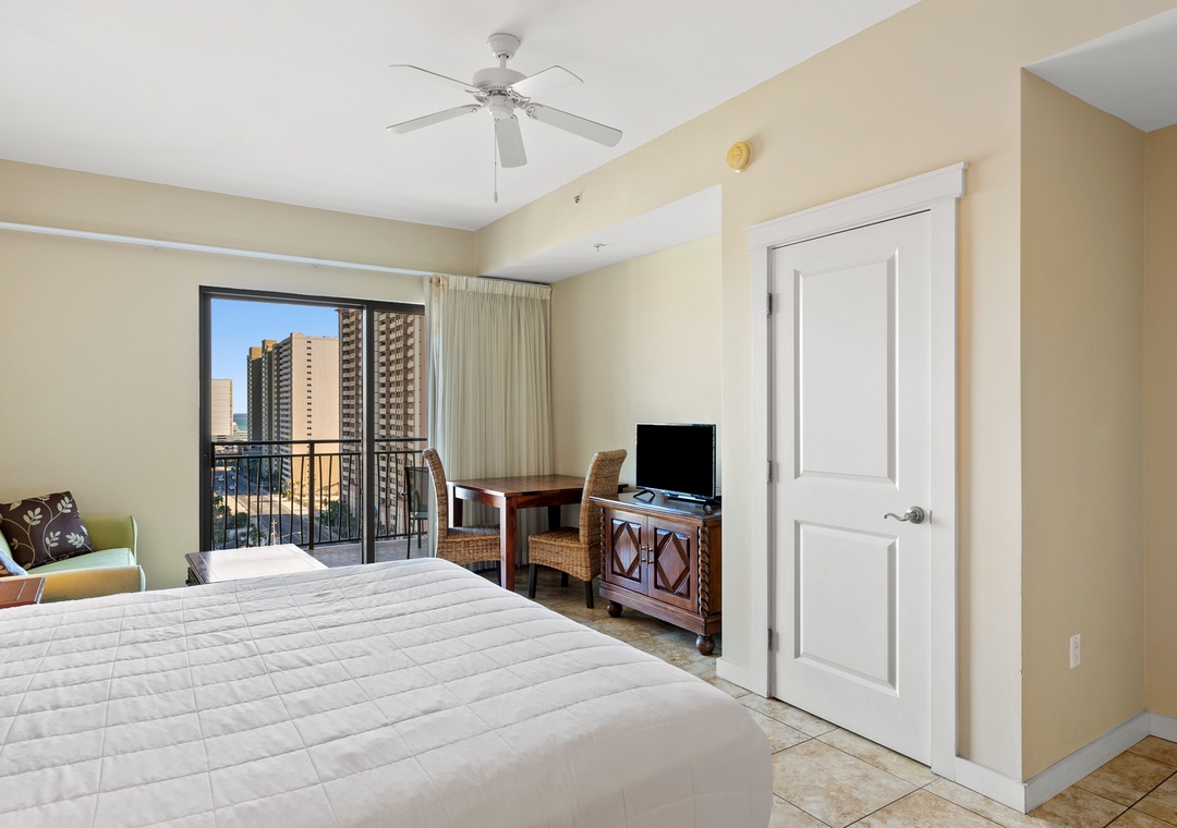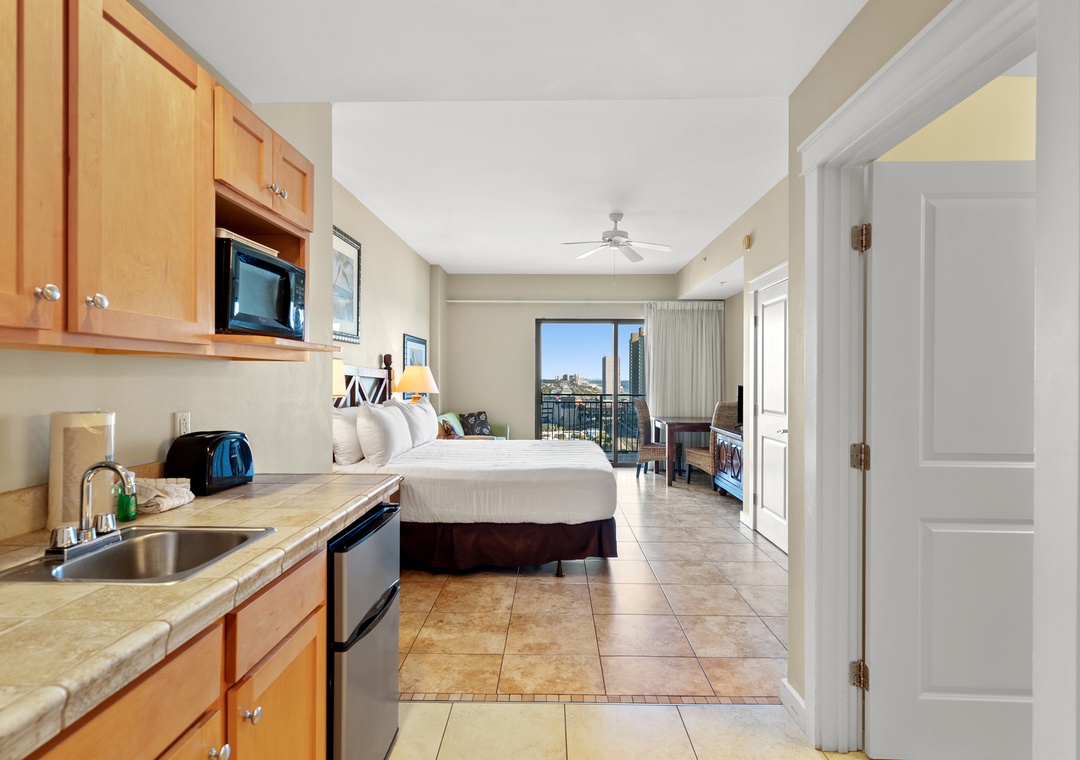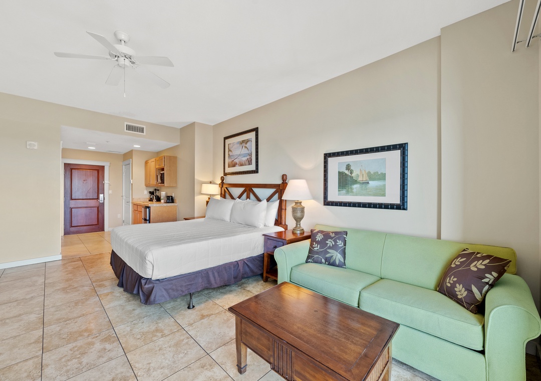 Studio units include one king bed, a mini-refrigerator, microwave, sink, coffee maker, 1-flat-screen TV, 1-bath with a full-size tub and shower unit, as well as private beach access and covered parking.