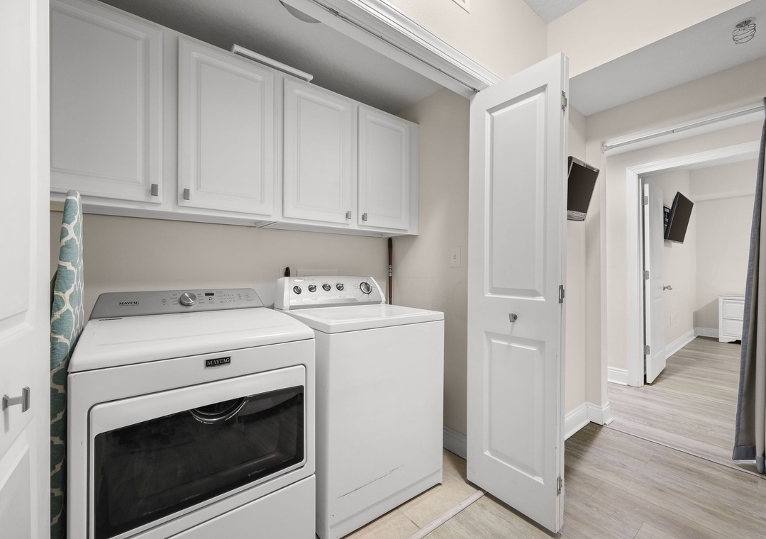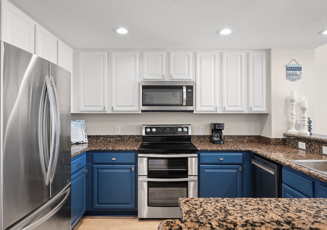 The full-sized stainless-steel appliances in the kitchen include a full-size refrigerator, dishwasher, microwave and oven. The kitchen comes fully equipped with basic necessities like pots, pans, coffee mugs, glasses, silverware etc.