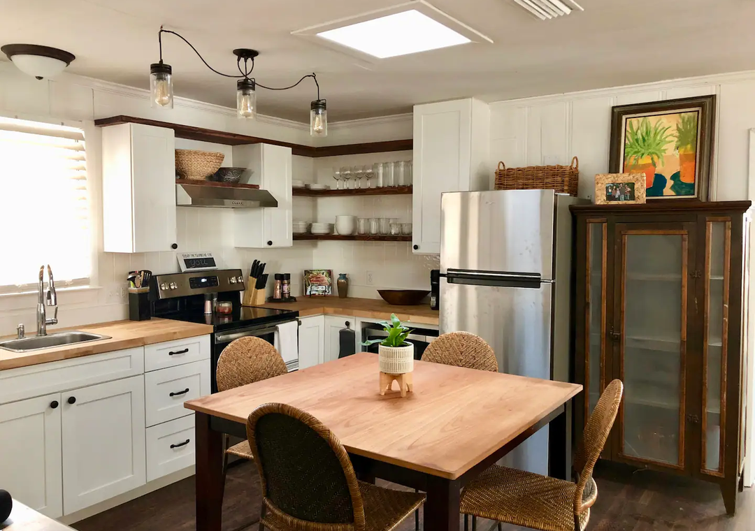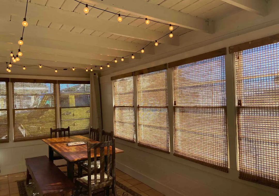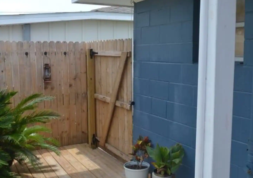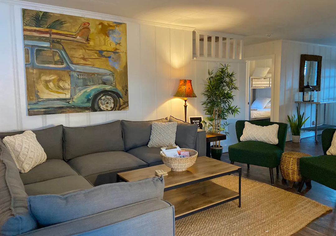 The bohemian interior is perfect for comfort and relaxation. There’s a large fenced in backyard with an outdoor shower to rinse off the salt and sand, a fire pit for roasting marshmallows, and a covered patio to enjoy meals!