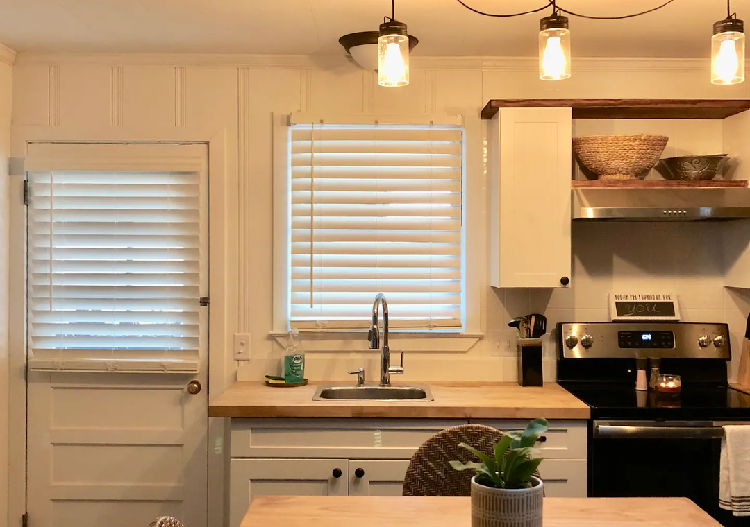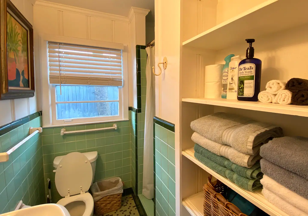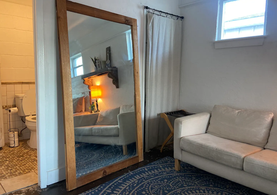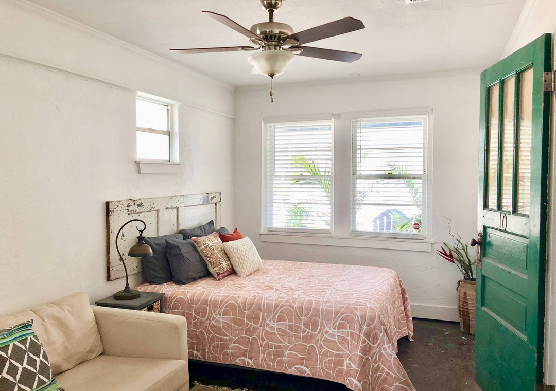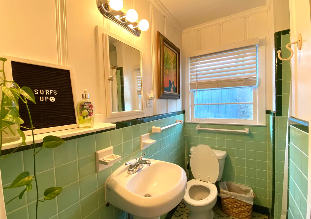 The bohemian interior is perfect for comfort and relaxation. There’s a large fenced in backyard with an outdoor shower to rinse off the salt and sand, a fire pit for roasting marshmallows, and a covered patio to enjoy meals!