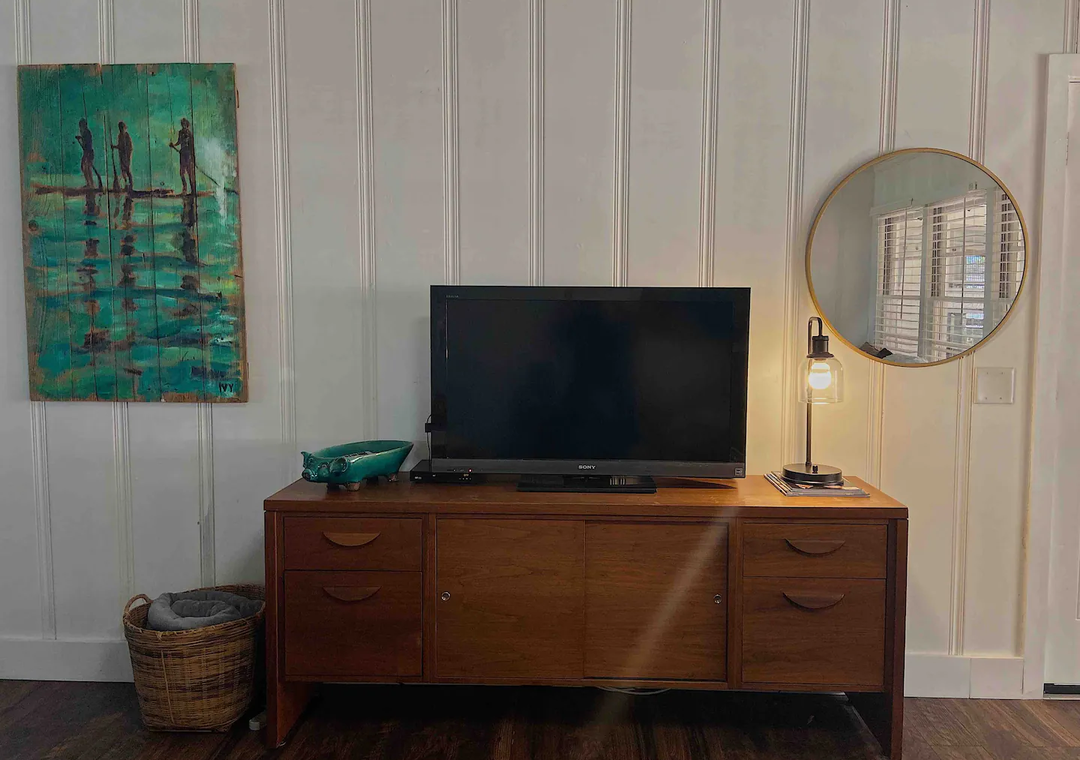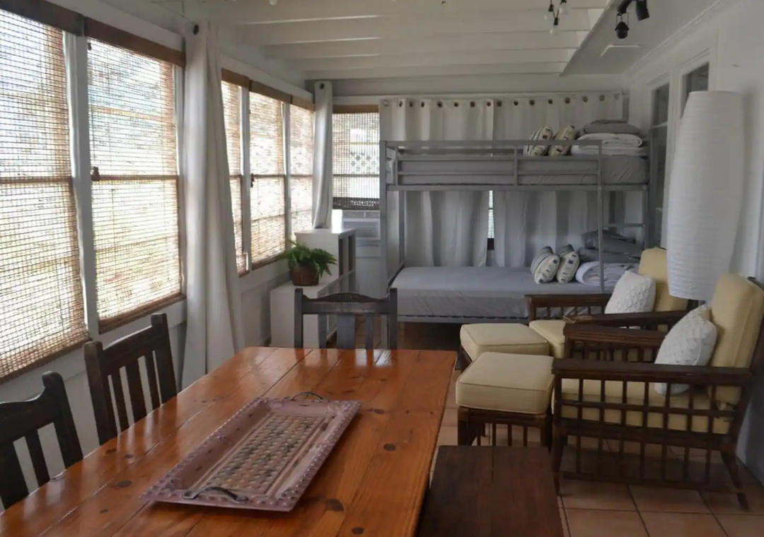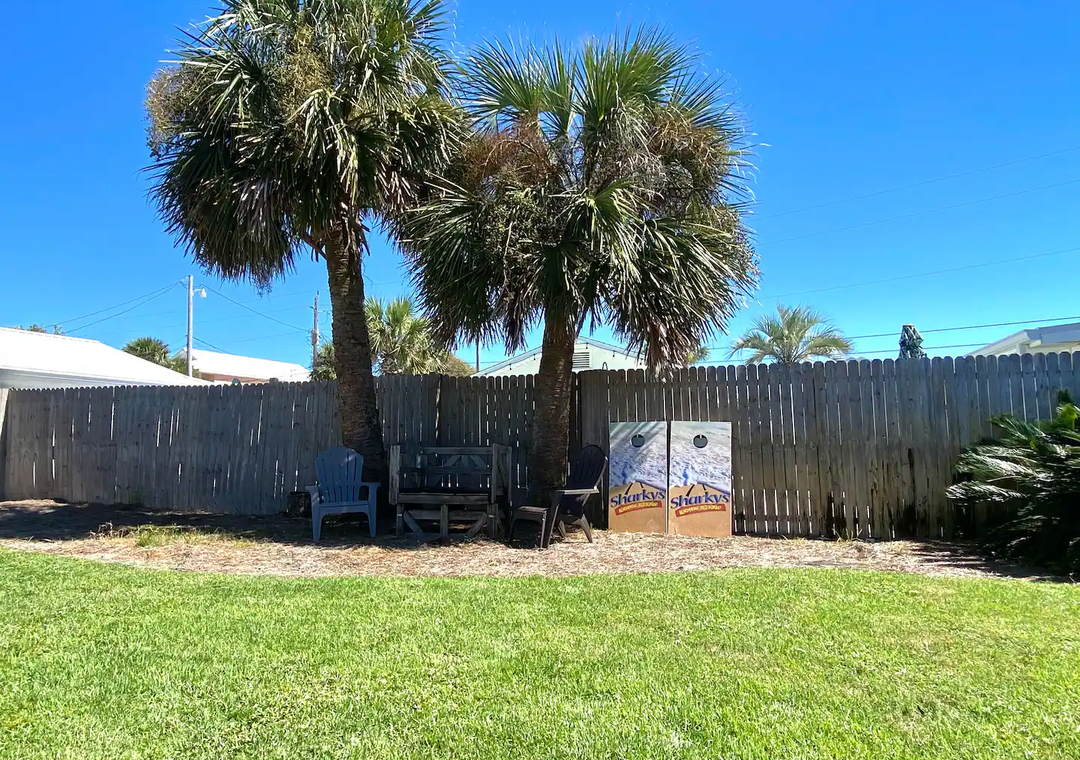 The living space has a Roku TV and DVD player. Three bedrooms come off of the living area; Master- King bed with private bath, Guest room 1- Double bed, Guest room 2- double bed bunks. At the front of the house is a 'sunroom' with a second double bed bunk. This room is also perfect to lounge and watch the sunset. For indoor activities our guests are supplied with, WIFI, a variety of movies, board games and puzzles. Take the fun outdoors and enjoy, corn hole, grilling under the covered patio, sunbathing in the backyard or sitting around the fire pit.