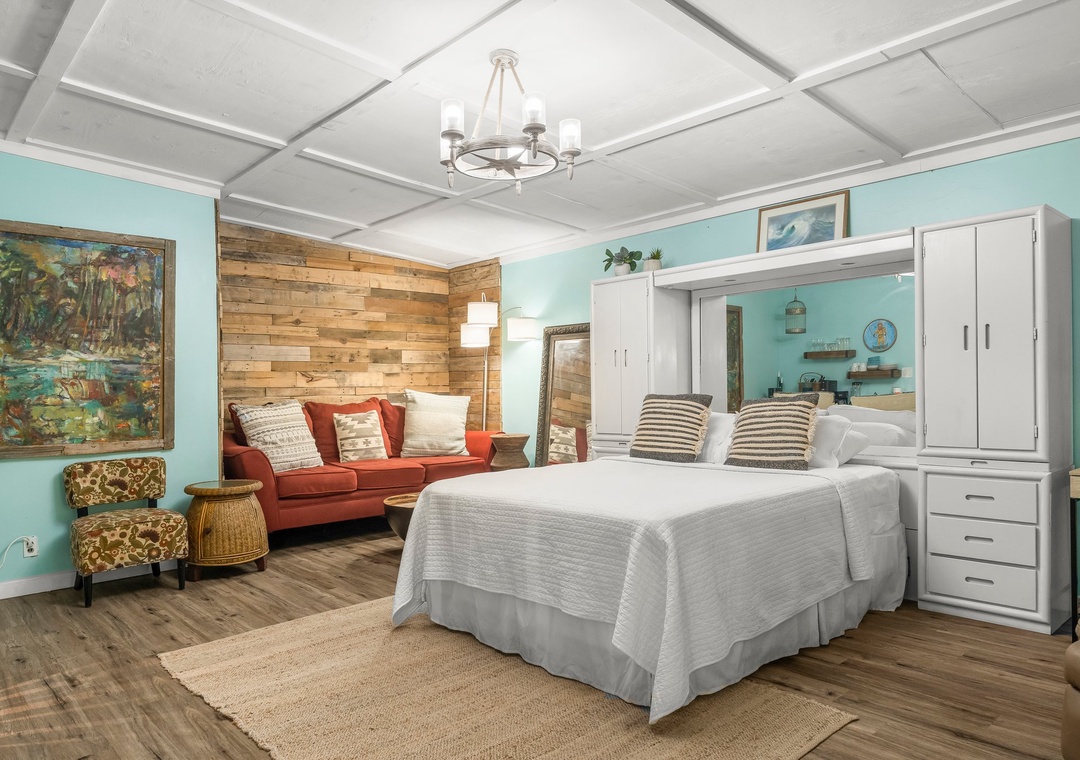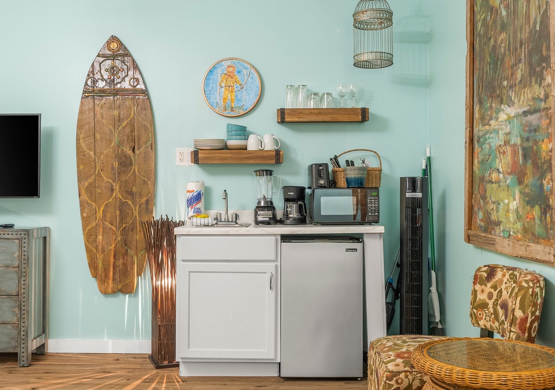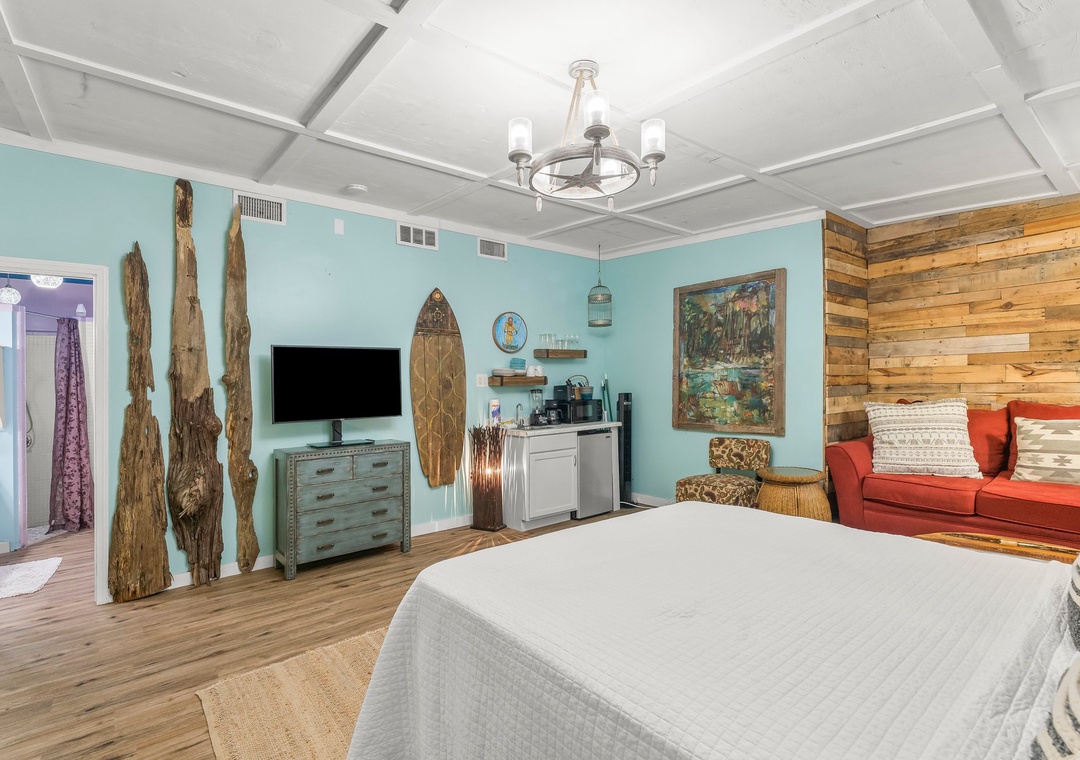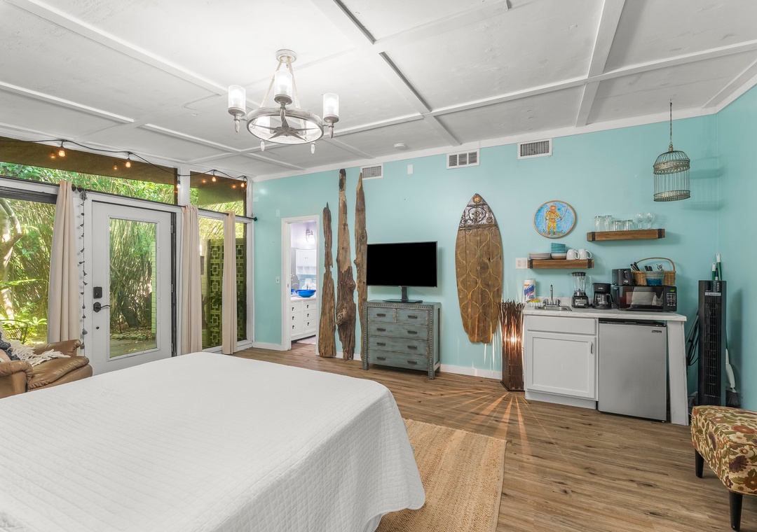 Zen Studio features a queen size bed, kitchenette with mini fridge, microwave, coffee pot. and blender, TV in bedroom and bathroom.